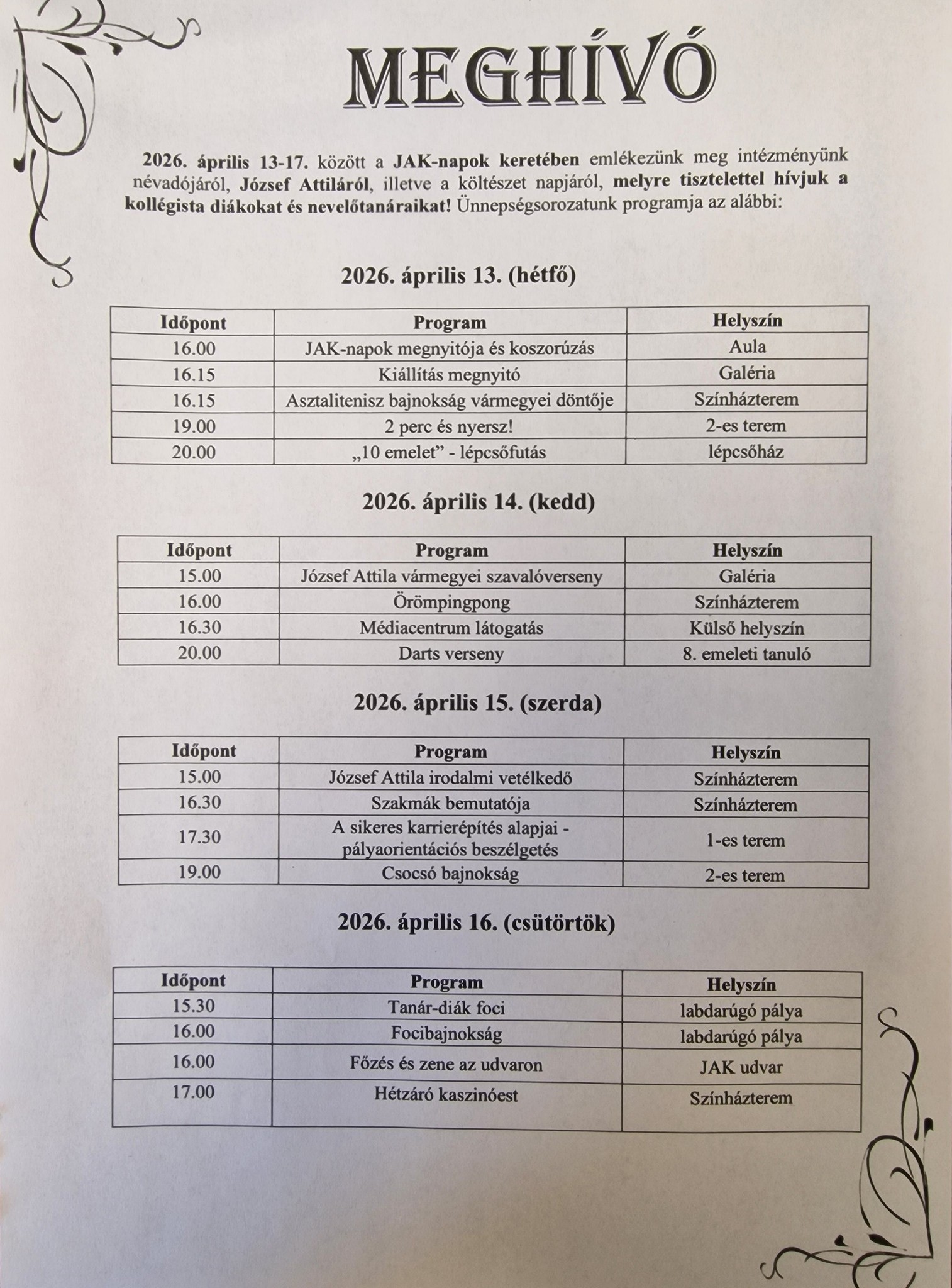 Névadónk, József Attila szellemiségében, a költészet napjához kapcsolódóan április közepén mindig egy izgalmas programsorozattal várjuk a kollégium lakóit és a középiskolásokat. A JAK-napok nemcsak a sportról vagy a versenyről, hanem a művészetről, a közös időtöltésről és az ünneplésről is szól. A célunk, hogy a JAK 250 fős kollégiumi közössége még szorosabbá váljon, miközben méltó módon tisztelgünk a 20. századi magyar irodalom egyik legnagyobb lírikusa előtt. Gyere te is! Csatlakozz!