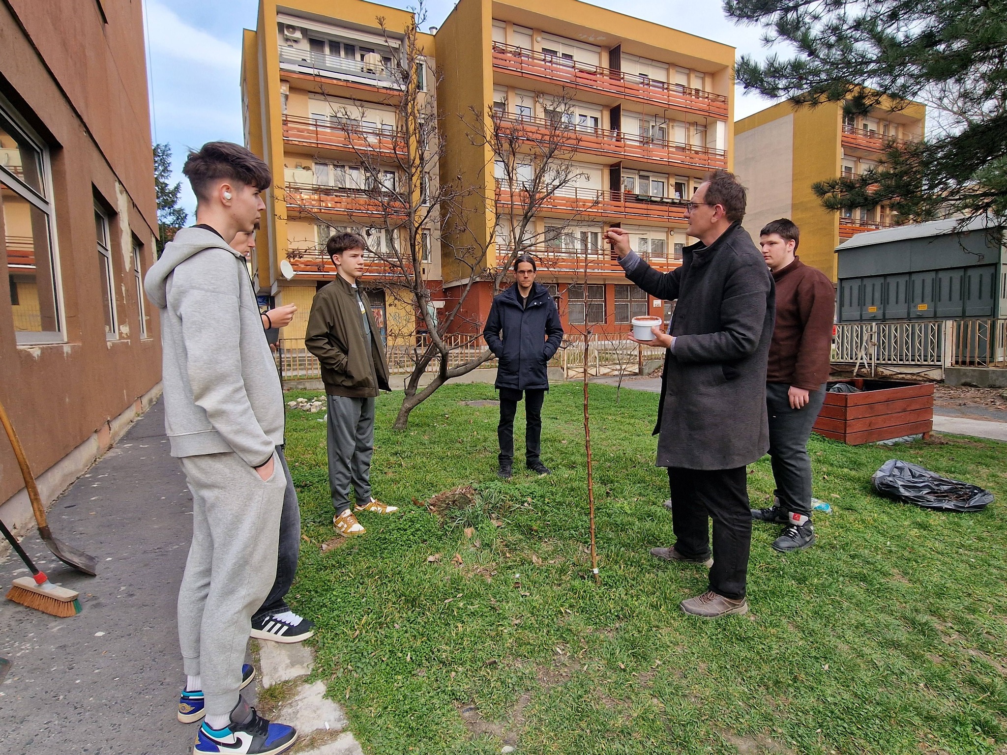 Az Öko kertben végzett tavaszi munkálatokat az Öko csoport. A nyílt foglalkozásra bárki eljöhetett, melyet ezúttal Horváth Lénárd tanár úr tartott. Megtudhattuk, hogy a tavasz a gyümölcsfák metszésének legfontosabb időszaka, amely alapjaiban határozza meg az éves termésmennyiséget és a fa egészségét. Az almafa metszését február végén, március elején, a rügyfakadás előtt végezzük el. Elsősorban a száraz, beteg, sérült vagy befelé növő ágakat távolítsuk el, hogy a korona szellős maradjon, és elegendő fény érje a termőrészeket. A barackfélék érzékenyebbek, metszésüket akkorra időzítsük, amikor a rügyek már duzzadnak, de még nem nyíltak ki. A cél a váza alak kialakítása, a tavalyi vesszők visszametszése és a bőséges termés érdekében a ritkítás.Mindkét fajnál használjunk éles, fertőtlenített metszőollót, és a vágásokat a rügyek felett, enyhén ferdén végezzük.