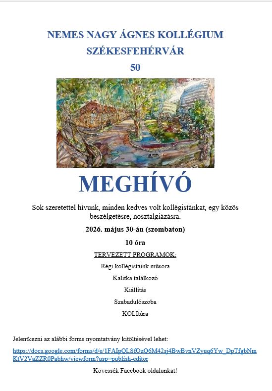 Szeretettel várjuk volt kollégistáinkat, tanárainkat, itt dolgozó kollégáinkat a jubileiumi emlékév kapcsán megrendezett találkozónkra. A következő linken keresztül lehet jelentkezni a rendezvényre: